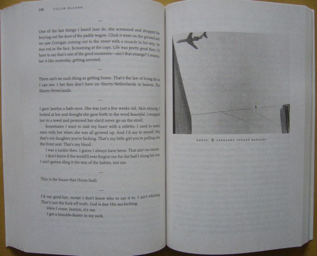 The photograph is mentioned, however, at the start of the last section, set in October 2006. Although the reproduction shows no signs of being torn, it was discovered, we are told, “yellowing and torn” in a garage sale in San Francisco in 2002 by one of the prostitutes’ daughters, who is drawn to it, she says, because it was “taken on the same day her mother died” (she was killed with the Irishman in a car crash), and because of “the sheer fact that such beauty had occurred at the same time”, while the narrator adds: “A man high in the air while a plane disappears, it seems, into the edge of the building. One small scrap of history meeting a larger one. As if the walking man were somehow anticipating what would come later. The intrusion of time and history. The plane passes, the tightrope walker gets to the end of the wire. Things don’t fall apart”.