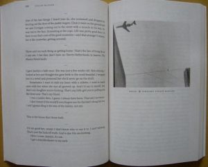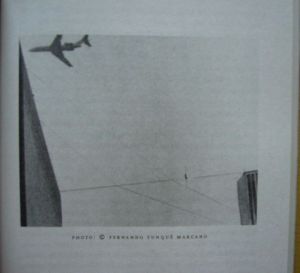 But to get back to the photograph, which is reproduced approximately two-thirds into the novel. Taken from the ground, apparently, it shows the microscopic tightrope walker on the wire stretched between the towers, while a plane is seen in the top-left corner, its nose close to the edge of one of the towers. It is, surprisingly, copyrighted to the young Hispanic photographer, Fernando Yunqué Marcano, whose name is given in the caption under the photograph. Although photographs in novels are sometimes said to have been taken by one or other character, this is the only case I know of where the fiction is pushed to include the copyright – a somewhat futile exercise, perhaps, since in his author’s note McCann tells us the photograph is by Vic DeLuca, Rex Images (copyright Rex USA).