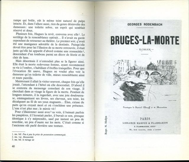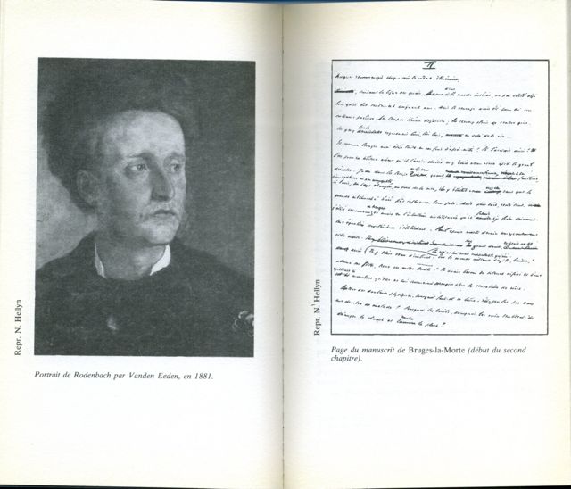 The Babel version, edited by Christian Berg, does not reproduce a single one of the 35 photographs reproduced in the original book version: his is a purely textual edition. Strangely enough, however, it does include eight pages of documents that are inserted, for some reason, in the middle of chapter four. Among these documents one finds, for instance, the pieces pictured below: a frontispiece by Fernand Khnopff for an edition by Flammarion, a portrait of the author, and a copy of a manuscript page. Strangely enough, the Babel edition does include the foreword by Rodenbach in which he notes that his intention is to evoke “the Town as an essential character, associated with states of mind, counselling, dissuading, inducing the hero to act”, and that he thus wanted his readers to feel the town’s influence, to “experience for themselves the shadow cast over the text by the tall towers” (I’m quoting from the Dedalus translation). Needless to say, readers will have to turn to another edition if they want to see the photographs chosen by Rodenbach.
