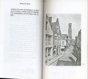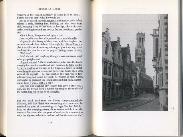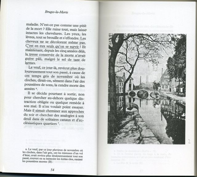 Mike Mitchell’s English translation, published by Dedalus (2005, rptd. 2007), includes none of the original photographs, but it does include a selection of recent photographs taken by Will Stone (who translated “The Death Throes of Towns”, an essay on Bruges by Rodenbach dating from 1888 and which is also included in the book): 17 photographs are to be found in the text of Bruges-la-Morte, and a further six in the text of “The Death Throes of Towns”. This decision, to include these contemporary photographs, was taken, Stone says, because it was thought this might be “more interesting” and that this might “stimulate debate”. Stone also notes that “despite the passing of time, it was clear that a number of those views to be found in the original images were being reproduced or at least ones which curiously evoked them”.